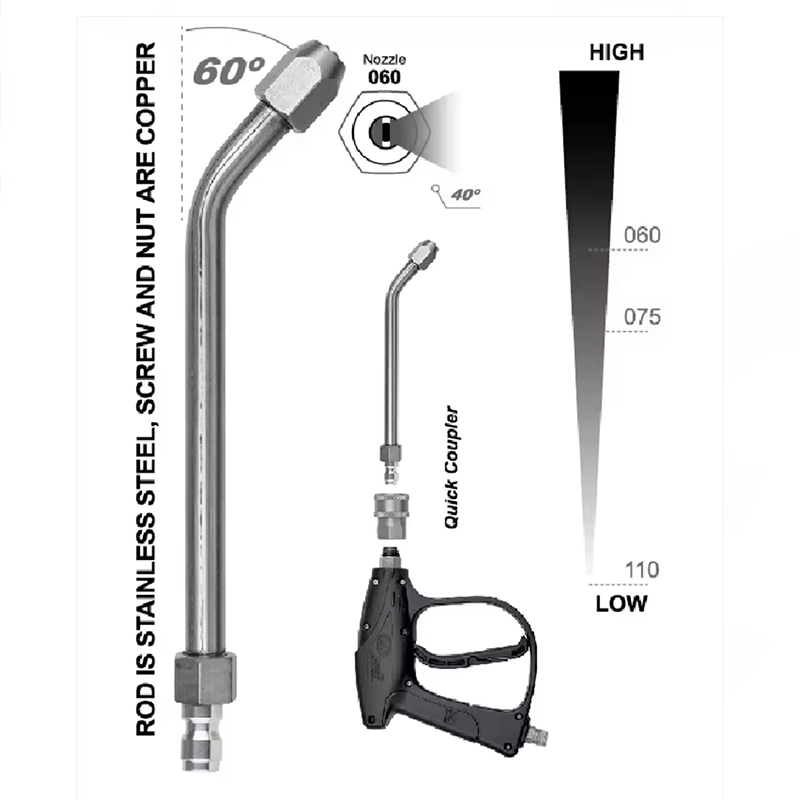 Konstrukcja wielkości tej zgiętej dyszy jest dokładna, zgięta 60 stopni, przy projekcie Di średnicy otworu wylotowego. 060 40 stopni, ten specjalny narożnik może łatwo sięgnąć do wąskiej wewnętrznej przestrzeni klimatyzatora w celu czyszczenia. Operacja może być bardzo elastyczna. Specyfikacja dyszy to 060, a kąt dyszy wynosi 40 stopni, więc może tworzyć odpowiedni przepływ wody do spłukiwania podczas operacji czyszczenia. Nilfisk i WAP to bardzo znane marki sprzętu do czyszczenia. Te dwie marki pistoletu do mycia mają stabilny przepływ wody pod wysokim ciśnieniem i mogą dokładnie kontrolować czyszczenie, więc są szeroko stosowane w czyszczeniu pracy w wielu scenariuszach. Zgięta dysza Nearinsky'ego pasuje do pistoletu WAP/Nilfisk, dzięki czemu może wygodnie wyczyścić klimatyzator przy współpracy obu stron i może skuteczniej wyczyścić kurz i brud w klimatyzatorze. Czyszczenie klimatyzatora na czas jest przeznaczone nie tylko dla ludzi, jest dobre dla zdrowia, a także może przedłużyć żywotność samego klimatyzatora.
