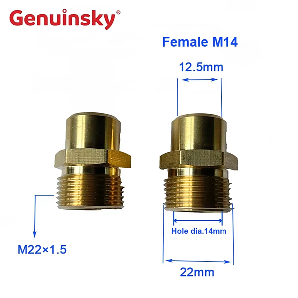 Mosiężna montaż rur odpowiedni do urządzeń do mycia samochodów pod wysokim ciśnieniem. Przede wszystkim zacznijmy od wielkości samego produktu. Jednym końcem jest nić męska M22 × 1,5, o średnicy 22 mm i Dile Dia.14 mm. Na drugim końcu znajduje się kobiecy wątek M14 o średnicy 12,5 mm. Według potrzeb można go stosować z odpowiednimi maszynami do czyszczenia pod wysokim ciśnieniem.