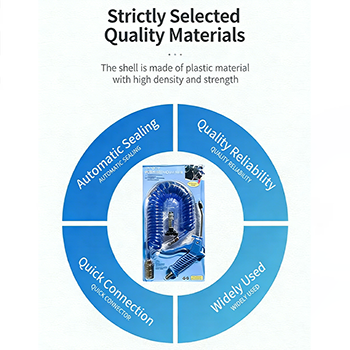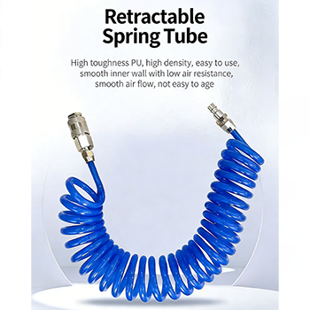 Teleskopowa tchawica sprężynowa w kombinezonie wykonana jest z materiału PU, a do wyboru są trzy kolory: czarny, niebieski i czerwony. Wewnętrzna ściana bardzo wytrzymałego materiału PU jest gładka, co zmniejsza opór powietrza i zapewnia płynniejszy przepływ powietrza. Jednocześnie materiał PU ma doskonałą odporność na zużycie i starzenie, a ciśnienie robocze może osiągnąć 1000 Mpa, co może zapewnić silny przepływ powietrza podczas usuwania kurzu, dzięki czemu usuwanie pyłu jest bardziej wydajne. Bardzo praktyczne są także szybkozłącza na obu końcach tchawicy. Konstrukcja wtykowa nie wymaga użycia narzędzi, a połączenie z wiatrówką i źródłem powietrza można wykonać w ciągu kilku sekund, co znacznie poprawia efektywność pracy.