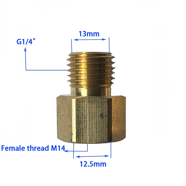 Rozmiar samego produktu jest ściśle zaprojektowany zgodnie z odpowiednim rozmiarem. Do wyboru są dwie specyfikacje. Pierwszy rodzaj złączki, jeden koniec to G1/4 cala, o średnicy 13mm, a drugi koniec to gwint wewnętrzny M14×1,5, o średnicy 12,5mm. Drugi rodzaj złączki, jeden koniec to gwint zewnętrzny M14 o średnicy 14 mm, a drugi koniec to gwint wewnętrzny M14×1,5 o średnicy 12,5 mm i konstrukcja stożka wewnętrznego. Konstrukcja stożka wewnętrznego może być ściśle dopasowana do stożkowej powierzchni odpowiedniego złącza, tworząc ponownie uszczelnienie wtórne, dzięki czemu można znacznie poprawić szczelność i wytrzymałość połączenia na ciśnienie. Złączka mosiężna M14x1,5 żeńska do męskiej M14 to mosiężny materiał o dużej odporności na korozję i ciśnienie. Transport płynów wymaga długotrwałego wilgotnego środowiska i jest podatny na reakcje chemiczne. Dlatego właściwości materiału mosiężnego mogą go utrzymać. Jest stabilny i niełatwy do rdzewienia i złamania, co wpływa na cały przebieg pracy. Wydłuża także żywotność samego produktu i zmniejsza koszty wymiany sprzętu.