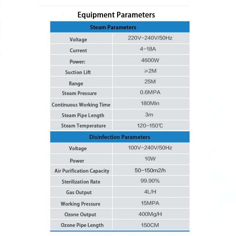 Tenmaszynajest wyposażony w profesjonalną przenośną pudełko ochronne, wyposażone w różne rurociągi, wygodne przechowywanie, odpowiednie do czyszczenia domu i dezynfekcji, czyszczenia samochodu, cateringu i hotelu oraz innych powiązanych scenariuszy. Maszyna może być używana do wielu celów, ponieważ ma takie funkcje, jak para, dezynfekcja, zimna i gorąca woda, impuls itp., Z dużą wydajnością i elastycznym użyciem. Przede wszystkim wprowadzajmy niektóre dane funkcjonalne. Po pierwsze, funkcja pary, napięcie jest dostosowywane do 220 V - 240 V/50 Hz, moc wynosi 4600 W, zakres ssania wynosi ≥2 m, zakres działań wynosi 25 m, temperatura pary wynosi 120–150 ℃, ciśnienie pary wynosi 0,6 MPa i może kontynuować działanie przez 180 minut, a jednocześnie w tym samym czasie, 3 -metrowy może być elastyczna, a pary można łatwo usunąć, a pary może usunąć słupy i może kontynuować obsługę. Pomoc pary w wysokiej temperaturze. Po drugie, funkcja dezynfekcji, napięcie jest dostosowywane do 100 V - 240 V/50 Hz, moc wynosi 10 W, pojemność oczyszczania powietrza wynosi 50–150 m²/h, szybkość sterylizacji wynosi aż 99,90%, wyjście gazu wynosi 4 l/h, ciśnienie robocze wynosi 15 mPa, a Ozone wynosi 400 mg/h, 150 -cm rurka olgonna puszka Disinfection, a obszar puszczy i puszczy i pazu i pazu wynosi paz. Temperatura w temperaturze 120-150 ℃ może skutecznie wykonywać aktywność sterylizacyjną i może zabić wszelkiego rodzaju bakterie lub roztocza.