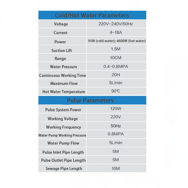 Po trzecie, funkcja przełączania zimnej i ciepłej wody, napięcie jest dostosowywane do 220 V - 240 V/50 Hz, moc zimnej wody wynosi 95 W, moc ciepłej wody wynosi 4600 W, zasięg ssący wynosi 1,5 m, zasięg wynosi 10 cm, ciśnienie wody wynosi 0,4 - 0,8 MPa, co może z 20 godzinami pracy, największą szybkość przepływu 5 l/min, do 90 ℃, co wynosi 0,4 - 0,8 MPa Tryb ciepłej wody lub tryb zimnej wody można przełączać zgodnie z różnymi scenariuszami użytkowania. Po czwarte, funkcja impulsu. Moc układu impulsowego wynosi 120 W, napięcie robocze wynosi 220 V, częstotliwość wynosi 50 Hz, ciśnienie robocze pompy wynosi 0,8 MPa, prędkość przepływu wynosi 5 l/min, rura wlotowa i rura gniazdowa impulsowa wynosi 5 metrów, a rura ściekowa wynosi do 10 metrów, co jest bardzo pomocne w czyszczeniu rur.