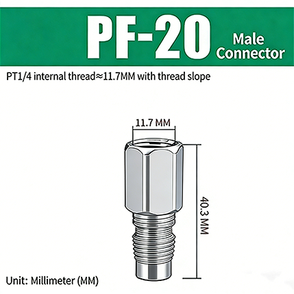 1. PF-20. gwint rurowy 1/4, ze skosem gwintu, średnica części gwintowanej wynosi około 11,7 mm, a całkowita długość produktu wynosi 40,3 mm.
