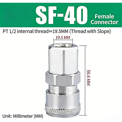 Szybkozłącza typu C serii PF–SF z gwintem JIS PT mają konstrukcję szybkozłącza typu C. Głowice męską i żeńską można dowolnie dopasowywać, a także można je podłączać i łączyć, co jest bardzo wygodne. W złączu zastosowano obróbkę galwaniczną powierzchniową z wewnętrznym rdzeniem miedzianym, który jest nie tylko odporny na korozję, ale także odporny na zużycie, co poprawia trwałość złącza i wydłuża jego żywotność.