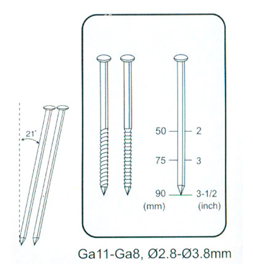 Specyfikacje paznokci to GA11-GA8 o średnicy 2,8-3,8 mm i długości zwykle o 50 mm, 75 mm i 90 mm (2-calowe, 3-calowe, 3-1/2-calowe). Kąt nachylenia układu paznokcia wynosi 21 stopni. Głębokość paznokci można regulować zgodnie z potrzebami pracy.