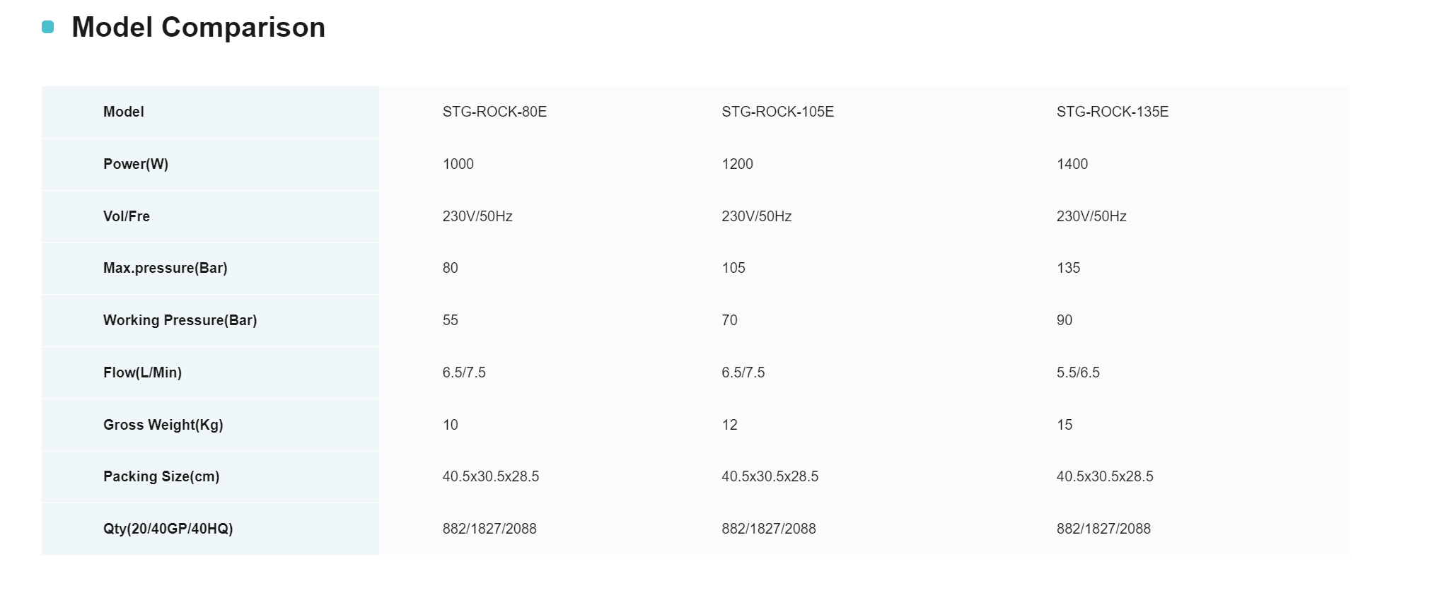 Przenośna myjka wysokociśnieniowa STG-ROCK-E dzieli się na trzy modele, a mianowicie STG-ROCK-80E, STG-ROCK-105E i STG-ROCK-135E. Specyfikacje zasilania trzech modeli to 230 V/50 Hz, a wymiary opakowania również wynoszą 40,5 × 30,5 × 28,5 cm. Liczba skrzynek do szafek wysokich jest również taka sama. Liczba skrzynek dla szaf o wysokości 20 stóp wynosi 882 sztuki, liczba skrzynek dla szaf wysokich 40GP to 1827 sztuk, a liczba skrzynek dla szaf wysokich 40HQ Liczba skrzynek to 2088 sztuk.